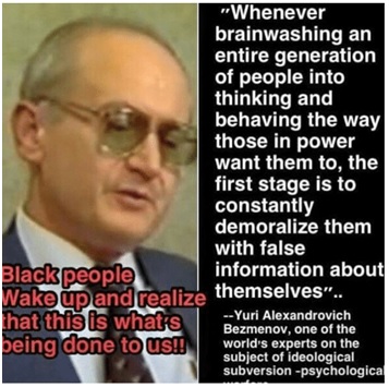 Yuri Bezmenove waxa uu noqday raga ugu caansan mawduuca “Ideological subversion” ama buburinta maanka ama fikirka” waxaana uu qoray buug lagu magacaabo khiyaamadu waxay ahayd shaqadaydii, waxaana uu kaga waramaya sida dawladaha loo baabiiyo iyadoo aan dagaal lagu qaadin,taasi oo ah in akhlaaqda iyo dhaqanka bulshadaasi lagu burburiyo ugu badnaan 20 sano oo ah inta hal fac ka korayo ah kuwaasi oo xambaaraya dhaqanka la gashaday ee burburinta ah. Waxa uu sheegay inay arimaha ugu fiicani ay yihiin in iyaga lagu niyad jebyo warar been ah oo ku sabaasan arimoohda.