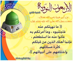 Waxaa laga weriyay Abuu-Hureyra Cabdur-Raxmaan ibnu Sakhar (Rc) inuu yidhi : waxaan maqlay Rasuulkii Allah(Scw) oo leh: “ Waxaan idinka reebo ka dheeraada, waxaan idin farayna la yimaada intaad awoodi kartaan, waxa halaagay dadkii idinka ka horeeyey su’aal badnaan iyo khilaafkii Nebiyadooda.” ( Bukhaari iyo Muslim)