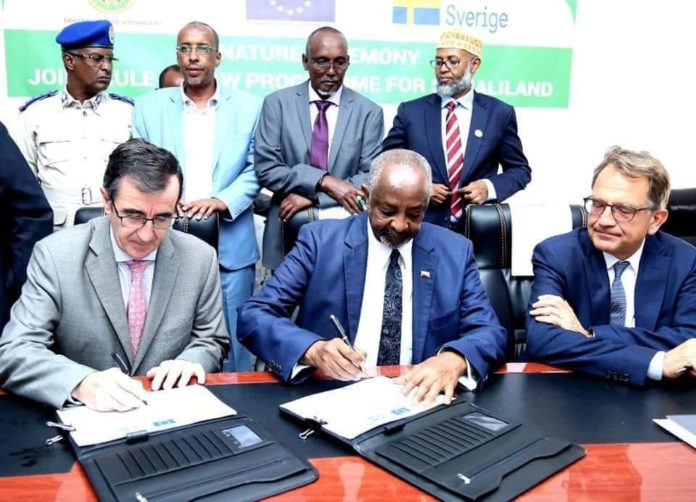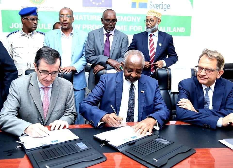 Hargeysa (Dawan) Wasiirka wasaaradda arrimaha gudaha Somaliland midane Maxamed Kaahin Axmed iyo Midowga Yurub oo kala saxeexday mashruuc dib loogu habaynayo hay’addaha garsoorka iyo booliska Somaliland.
