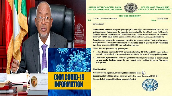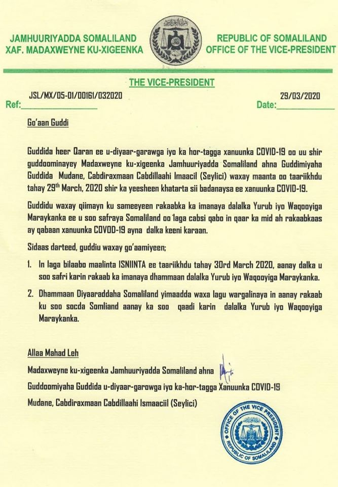 War-murtiyeedkan oo uu ku saxeexan yahay madaxweyne ku-xigeenka Somaliland oo ahna guddoomiyaha guddida heer Qaran ee u diyaar-garowga iyo ka hor-tagga cudurka Coronavirus, mudane Cabdiraxmaan Cabdillaahi Ismaaciil (Saylici), ayaa lagu sheegay in laga bilaabo 30-ka bishan March oo berri ku beegan la joojiyey dadka reer Somaliland ka soo dhoofa Yurub iyo Waqooyiga Qaaradda Ameerika.