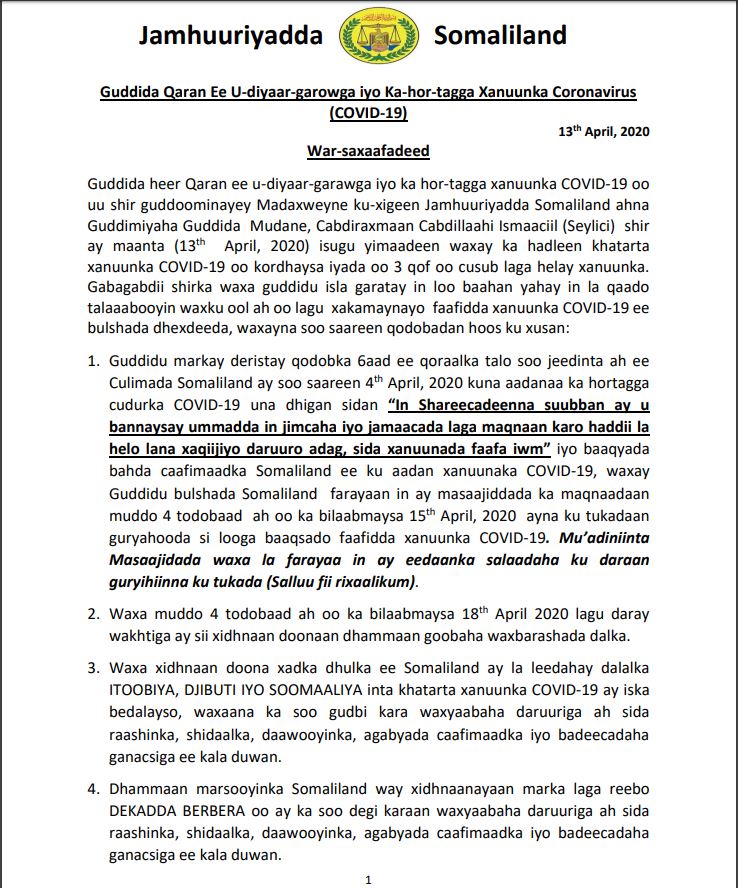 Guddida heer qaran ee xakamaynta cudurka Corona virus, ayaa soo saaray go’aamo hor leh oo ay bulshada ugu direen awaamiir iyo farriimo cusub oo wacyi-gelin ah.