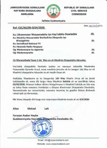Farxaan Aadan Haybe ayaa sheegay in Maadaama oo Fasaxii Dastuuriga ahaa ku beegmay Jimcaha, Fasaxa shaqaalaha Dawladda dib loogu riixay Sabtida, sidaasi darteedna uu Shaqaale-weynaha Dawladdu uu fasax yahay Maalinta Sabtida oo ku beegan 2-da bisha May, 2020.