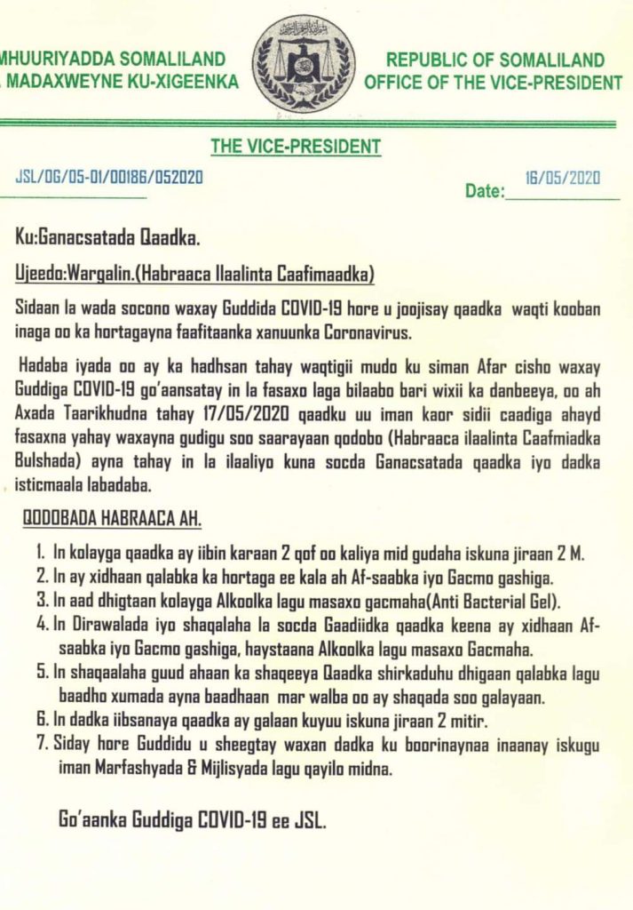 Hargeysa (Dawan) Guddida ka hortaga xannuunka Covid-19 ayaa shaaca ka qaaday in qaadkii dib loo fasaxay, laga bilaabo maalinta berri ah laga bilaabo.