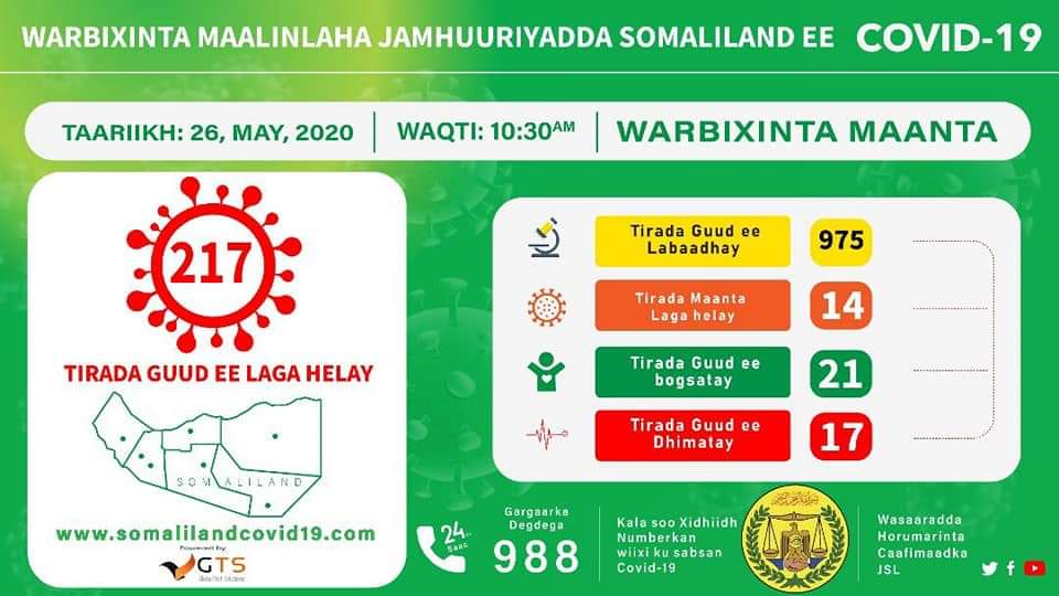 Sidoo kale, 14 xaaladood oo cusub oo xanuunka koofidh-19 ah (8 rag iyo 6 dumar ah) ayaa maanta laga helay Somaliland, taas oo tirada guud ka dhigaysa 217 xaaladood.