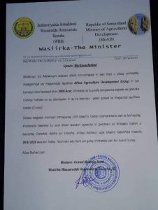 Hargeysa-(Dawan)- Wasiirka wasaaradda Beeraha Somaliland, Axmed Muumin Seed ayaa ka laabtay heshiis uu hore ula galay shirkad laga leeyahay dalka Shiinaha  taas oo geedka Coster ka beeri lahayd Wajaale.