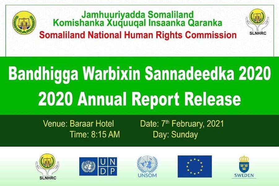 May be an image of text that says 'Jamhuuriyadda Somaliland Komishanka Xuquuqal nsaanka Qaranka Somaliland National Human Rights Commission SLNHRC Bandhigga Warbixin Sannadeedka 2020 2020 Annual Report Release Venue: Baraar Hotel Time: 8:15 AM Date: 7th February, 2021 Day: Sunday SLNHRC P UNSOM 실실 W SWEDEN'