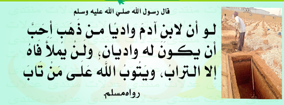 Ibn Cabbaas iyo Anas ibn Maalik (Rc) waxaa laga soo xigtay in Nebiga (SCW) yidhi: “ Banii Aadamku hadduu helo webi dahab ah, wuxuu jeclaan lahaa inuu labo yeesho, afkiisana (damaciisa) waxaa kaliya oo buuxin kara waa ciidda qabriga (taasi waa markuu dhinto) Allana waa ka toobad aqbalayaa kii toobad keena”. (Bukhaari iyo Muslim)