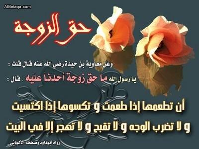 Mucaawiyah Ibna Xaydah (Rc) wuxuu yidhi: Waxaan ka codsaday Rasuulka Allah (Scw) inuu ii sheego waxa ay gabadhu ninkeeda xaq ugu leedahay? Wuxuu yidhi: “Quudi sidaada oo kale, markaad naftaada quudisidba. Arrad beelna sii sidaada oo kale ah markaad arrad baxdoba; wejigana ha ka garaacin; ha af lagaadeyn, markii aad u cadhooto oo aad doonayso inaad ka fogaato, guriga ha ka tegina, meel kale oo ka mid ah guriga seexo. “. Werin (Abuu Daawuud) Waxaana sugay sexeex inuu yahay Albaani.