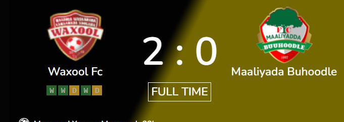 Waxaanay ku dhamaatay qaybtii hore ee ciyaartu 2-0 ay hogaanka ku haysay kooxda Waxool Hargeysa.
