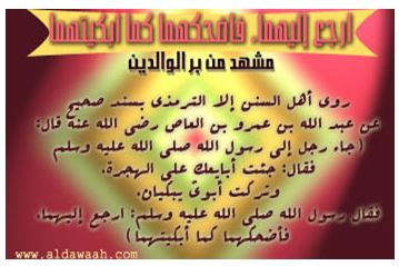 Cabdullaah ibn Camar ibn al-Caas (Rc) wuxuu Nebiga (scw) Ka weriyay:” Nin baa Nebiga (SCW) u yimid oo ku yidhi: “Waxaan doonayaa inaan balan kugula galo inaan haajiro jidka Ilaahayna ku dagaalamo, anigoo Allah ajar kaga doonaya”. Rasuulka Allah (scw) wuxuu weydiiyey: “Waalidkaa mid nooli ma jiraa ? Ninkii wuxuu yidhi: labadiiba way nool yihiin. Rasuulka Allah (scw) wuxuu weydiiyey: “Allah (sw) ajar ma ka doonaysaa? Ninkii wuxuu yidhi: Haah, Rasuul Allow. Rasuulka Allah (scw) wuxuu ku yidhi: “Haddaba iyaga ku noqo oo si fiican ugu sheqee”. (Bukhaari iyo Muslim).