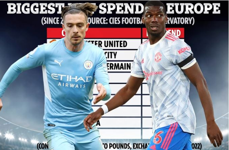 Manchester City oo lagu yaqaano inay lacago aad u badan ciyaartooyo ku kharash garaysay tobankii sannadood ee ugu dambeeyey ayaa waxa kasii sarraysa Manchester United oo iyadana  aanay lacagtaas badan ee ka baxday aanay xataa dibu-dhis ugu samayn naadiga, taas oo ka dhigan inay ka khasaartay.