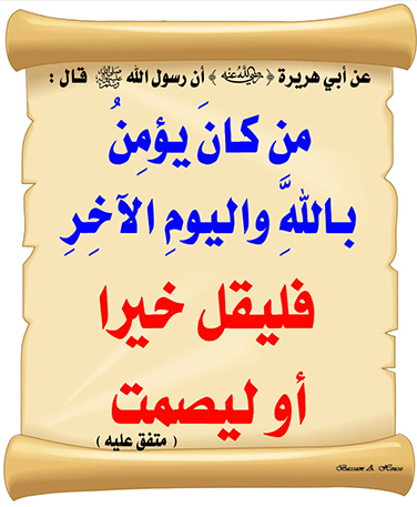 ”Inuu yidhi Rasuulkii Allah (scw) wuxuu yidhi: “ Qofkii rumeeyay Allah iyo maalinta qiyaamaha ha ku hadlo khayr ama ha iska aamuso, qofkii Allah iyo Qiyaamaha rumeeyay ha xurmeeyo jaarkiisa, qofkii Allah iyo qiyaamaha rumeeyay ha soo dhoweeyo martidiisa.”