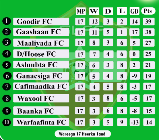 Kala sareynta kooxaha heerka koowaad ee caasimadda Somaliland oo maraya todobbaadkii 17aad ayay kooxuhu isku dhibco dhaw yihiin, taasoo muujinaysa in dheegga ay isku wada hayaan kooxo waawayn oo dhibic ama laba kala sareeya, inkastoo horyaalku dabayaaqo yahay.