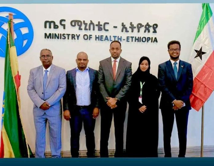 Wasiir-ku-xigeenka Wasaaradda Horumarinta Caafimaadka Jamhuuriyadda Somaliland, Mudane, Liibaan Yuusuf Cismaan oo ay weheliyaan: Agaasimaha Guud ee Wasaaradda Horumarinta Caafimaadka JSL, Dr. Maxamed Cabdi Xergeeye iyo Madaxa Nafaqada Wasaaradda, Marwo, Farduus Cismaan oo safar shaqo ku jooga dalka aynnu jaarka nahay ee itoobiya ayaa Shir balaadhan la qaatay Wasiiru-dawlaha Wasaaradda Caafimaadka dalka Itoobiya, Dr. Ayele Teshome.