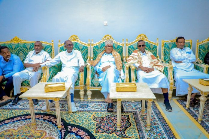 Berbera(Dawan):-Madaxweynaha Jamhuuriyadda Somaliland Mudane Cabdiraxmaan Maxamed Cabdillaahi Cirro iyo weftiga uu hoggaaminayo oo safar shaqo ku jooga Magaalada Berbera, ayaa ย xalay afurkii ย kullan afur iyo casho ah qasriga Madaxtooyadda Magaalo xeebeedka Berbera kula yeeshay Odayaasha Wax-garadka iyo Haldoorka Gobolka Saaxil.