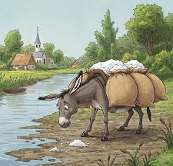 Ganacsadaha iyo dameerkiisa waxa ay ka gudbi jireen wabi yar si ay suuqa u gaadhaan. Si kastaba ha ahaatee, dameerka ayaa maalin si lama filaan ah oo nasiib ah ugu dhacay biyaha. Ka dib Milixdii ayaa milantay, taasoo keentay in kiishashkii fudayd noqdaan. Dameerka ayaa aad u farxay.